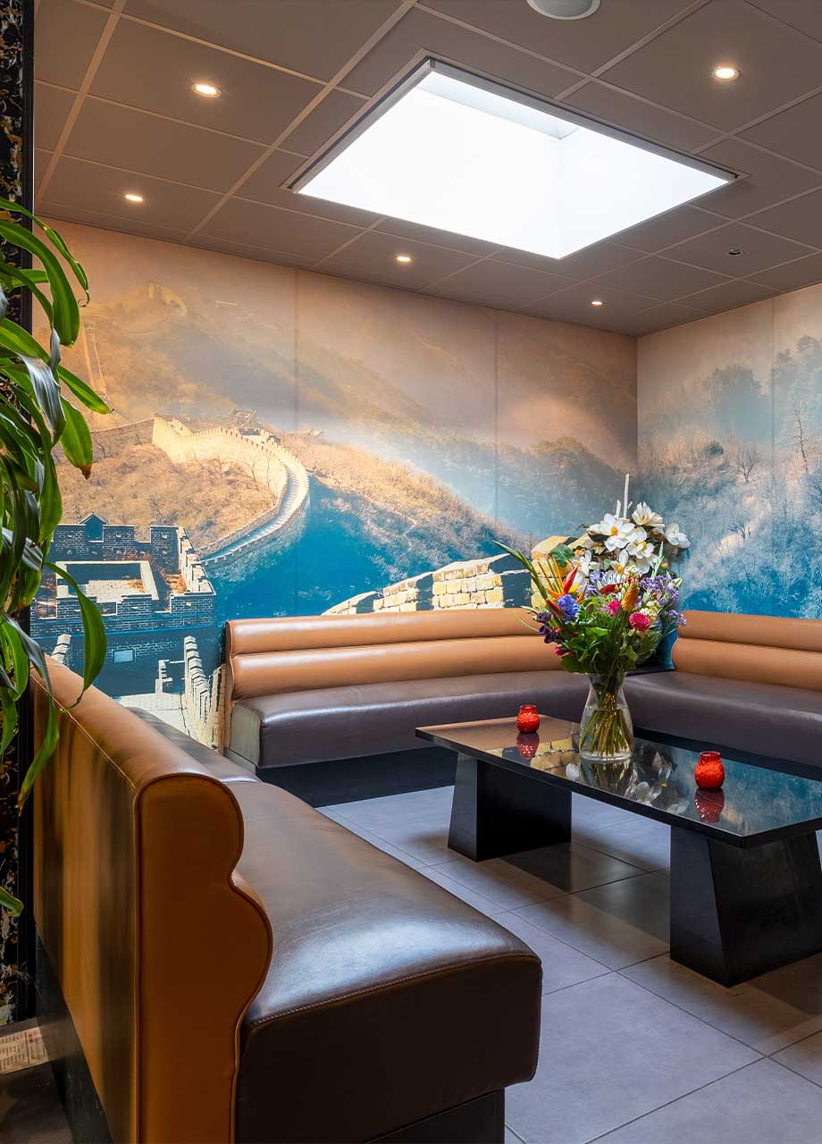 Ontdek ons ruime, moderne interieur dat plaats biedt aan meer dan honderd gasten, doordrenkt met de charme van het Verre Oosten. Of u nu op zoek bent naar een sfeervolle dineerervaring of een snelle afhaalmaaltijd, De Lange Muur staat voor u klaar.